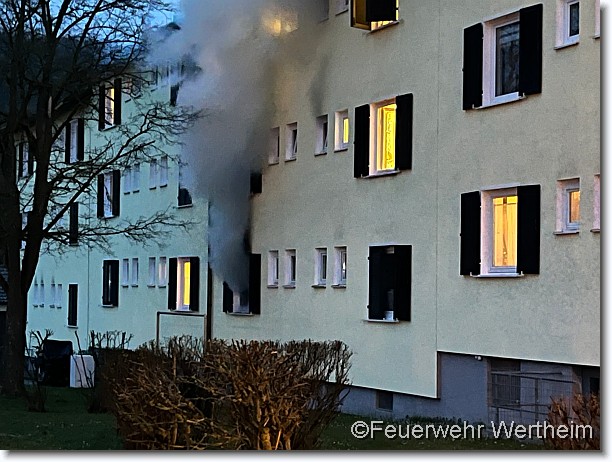 Um 05:58 Uhr wurde die Feuerwehr Wertheim zu einem ausgelösten Rauchwarnmelder alarmiert. An der Einsatzstelle stellte sich heraus, dass eine Wohnung im Erdgeschoss in Vollbrand stand. Der Rauch breitete auf die angrenzenden Wohnungen sowie das Treppenhaus aus, was die Evakuierung des Gebäudes erschwerte. Die Brandwohnung wurde von Angriffstrupps unter Atemschutz durchsucht. Das Feuer konnte schnell unter Kontrolle gebracht werden, eine Person in der Brandwohnung war allerdings bereits verstorben. Die Personen der anderen Wohnungen wurden vom Rettungsdienst betreut und teilweise in Krankenhäuser transportiert.